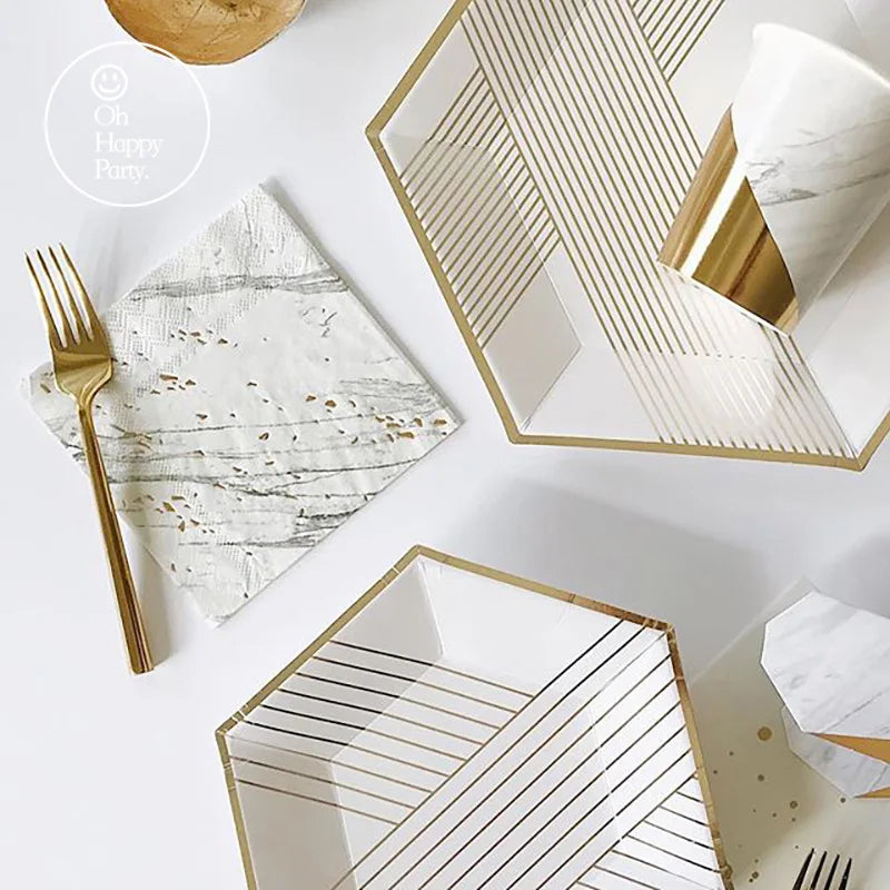 - Set-Inhalt: Teller, Becher, Servietten (je nach Variante auch Tischdecke & Strohhalme)